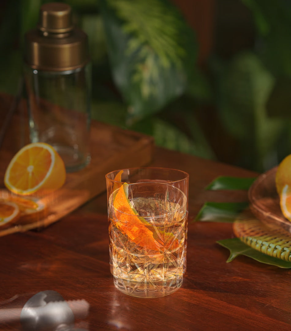 Place squared ice cube. Serve Flor de Caña 18 Year in the glass. Decorate with orange peel.