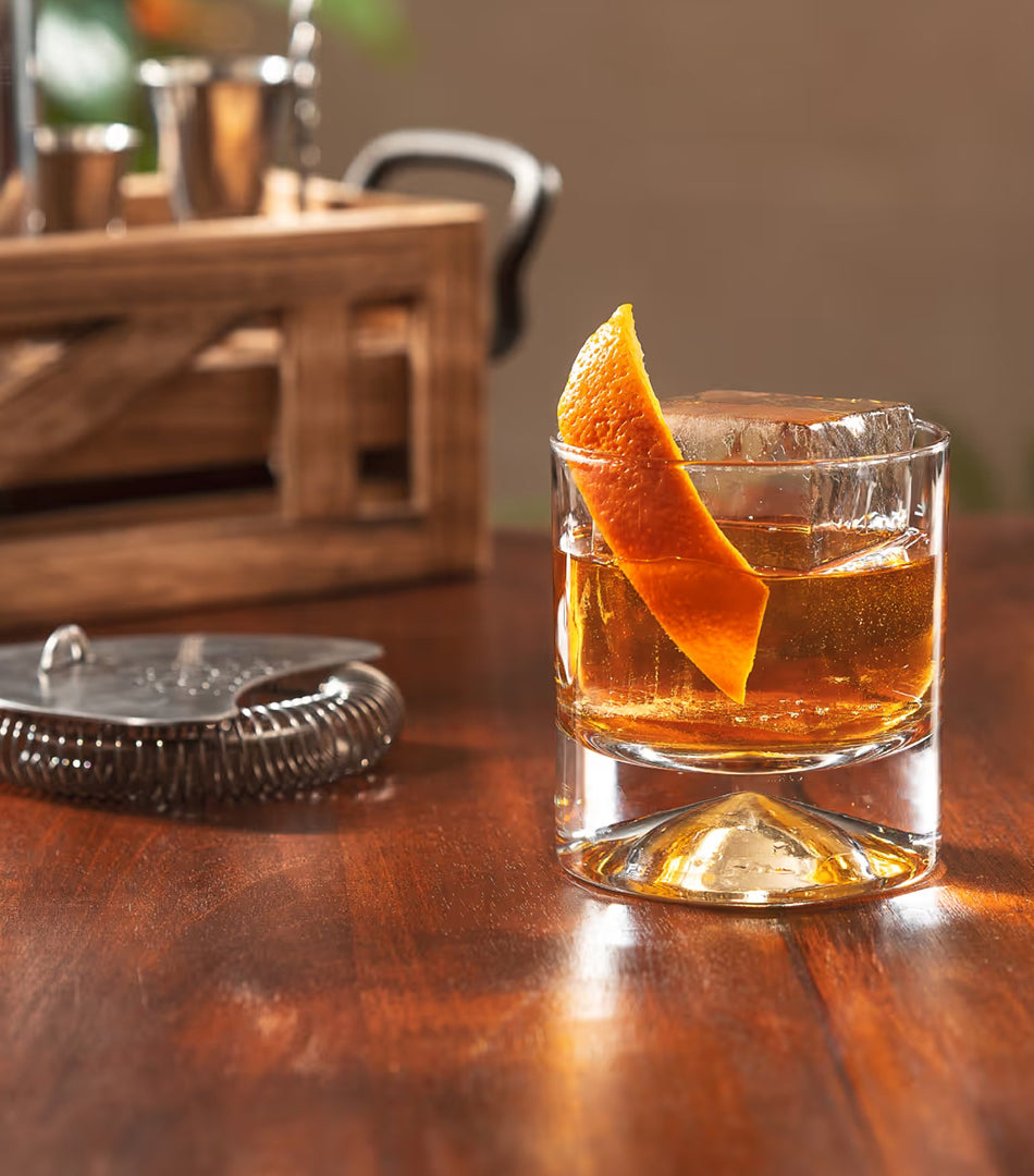 single block ice cube. Twist orange peel to express its